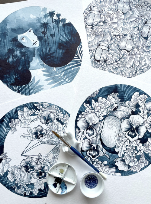 Remedios’ latest collection, Remediarium Primum is inspired by Remedios' poetic journey through her childhood garden visits. "Remediarium Primum" emerges from a world where myths, the hidden small details behind the garden's plants, and untold tales converge. Within these elements, the concept of 'remediarium' takes shape, drawing inspiration from the bestiaries of the Middle Ages that portrayed a variety of creatures and botanicals, combined with an essence of magical realism. This series is a testament to an era where ancient ink quills and paint brushes would intricately illustrate on pages that later could metamorphose into paper airplanes.